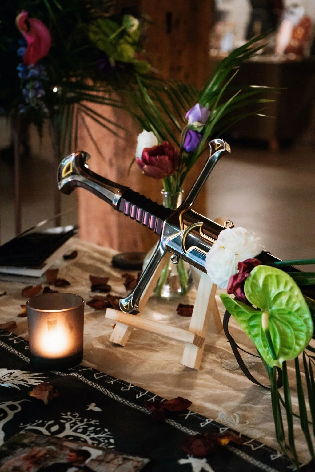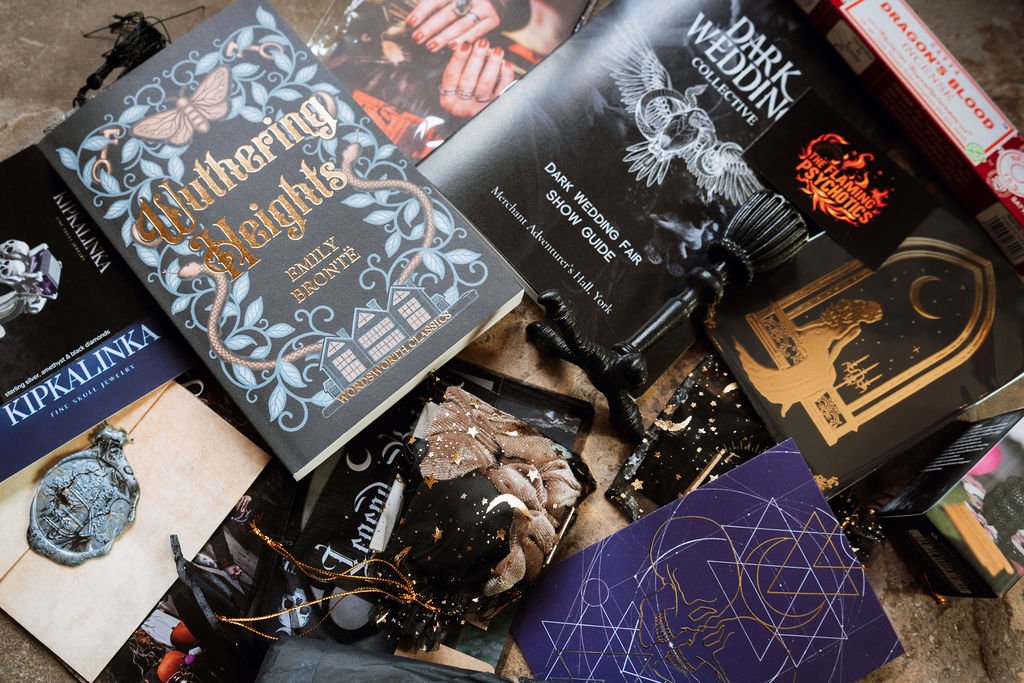 Inside, guests discovered a beautifully gilded copy of Wuthering Heights, alongside a raven claw candle holder and serpent incense holder - both inspired by the Dark Wedding Collective emblem.